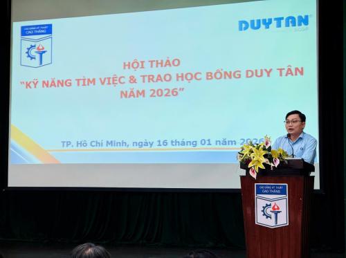 Buổi sáng ngày 16 tháng 01 năm 2026, tại hội trường A Trường Cao đẳng Kỹ thuật Cao Thắng diễn ra chương trình Hội thảo kỹ năng tìm việc và Trao học bổng sinh viên tiềm năng do Công ty cổ phần Sản xuất Nhựa Duy Tân tài trợ.